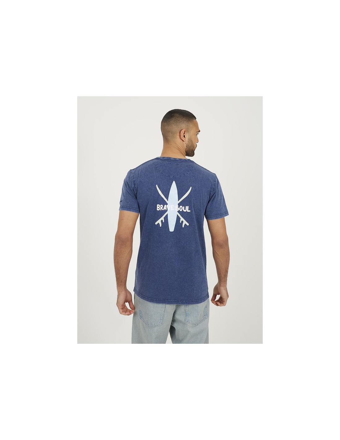 Camiseta de hombre manga corta, cuello caja, con estampado de tablas de surf en la espalda, detalle de estampado pequeño en el pecho