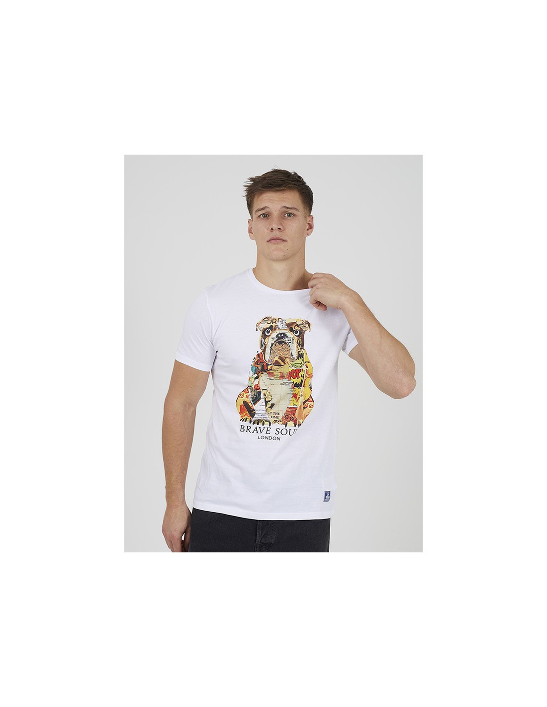Camiseta para hombre de manga corta y cuello caja. Print frontal de perro collage y "Brave Soul" en la espalda