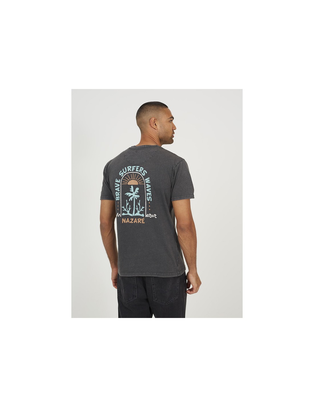 Camiseta de hombre manga corta cuello caja con estampado en la espalda y detalle de estampado pequeño en el pecho
