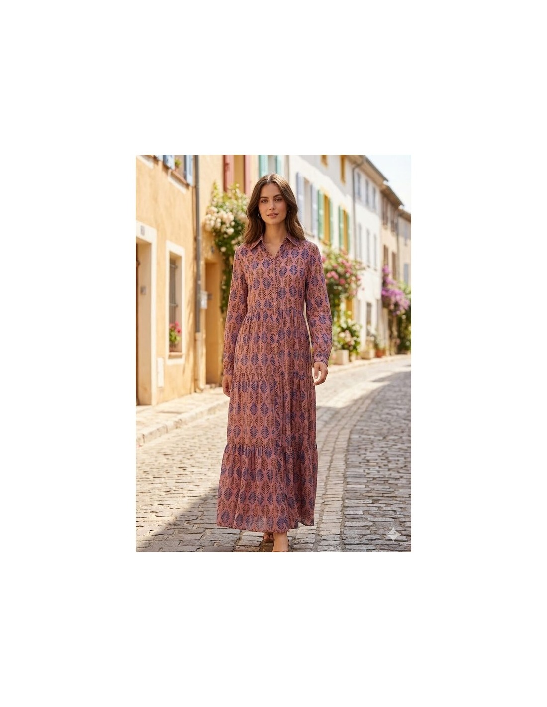 Vestido largo , de manga larga, estilo camisero, con abotonadura en la parte delantera