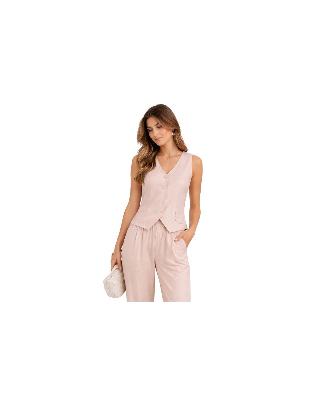 Conjunto de mujer compuesto por chaleco con cierre de botones y pantalón con cintura elástica