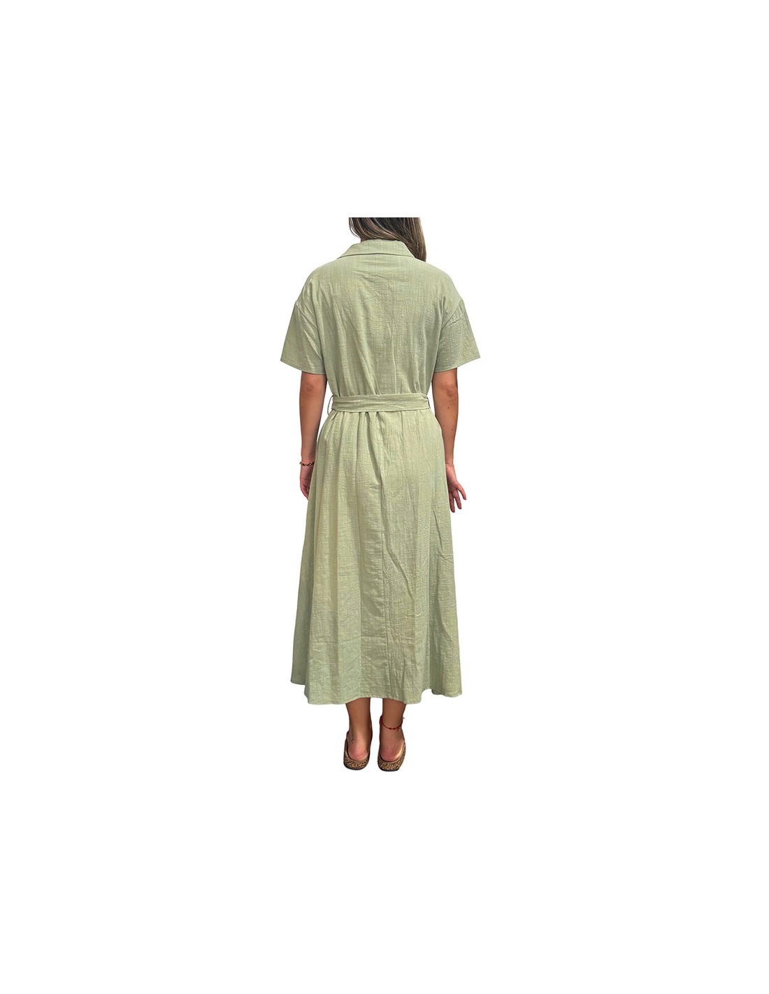 Vestido midi abotonado con manga corta y cinturón del mismo tejido